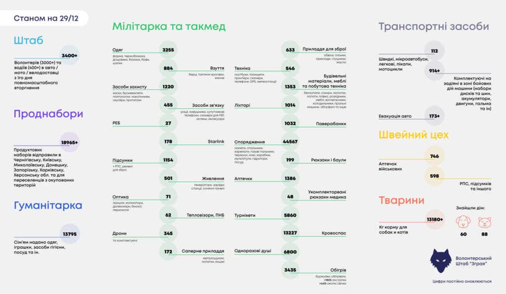 24 лютого 2022 року ми відновили волонтерський штаб «Зграя», пізніше зареєстрували ГО. Ми робимо все, що в наших силах: шукаємо потрібне, збираємо кошти та координуємо закупівлі і доставку захисникам, лікарням, цивільним, евакуюємо, надаємо медичну допомогу, проводимо тренінги та багато іншого. Намагаємося максимально оперативно та гнучко реагувати на поточні події та умови, створюючі нові напрямки і закриваючі ті, що вже не є актуальними.