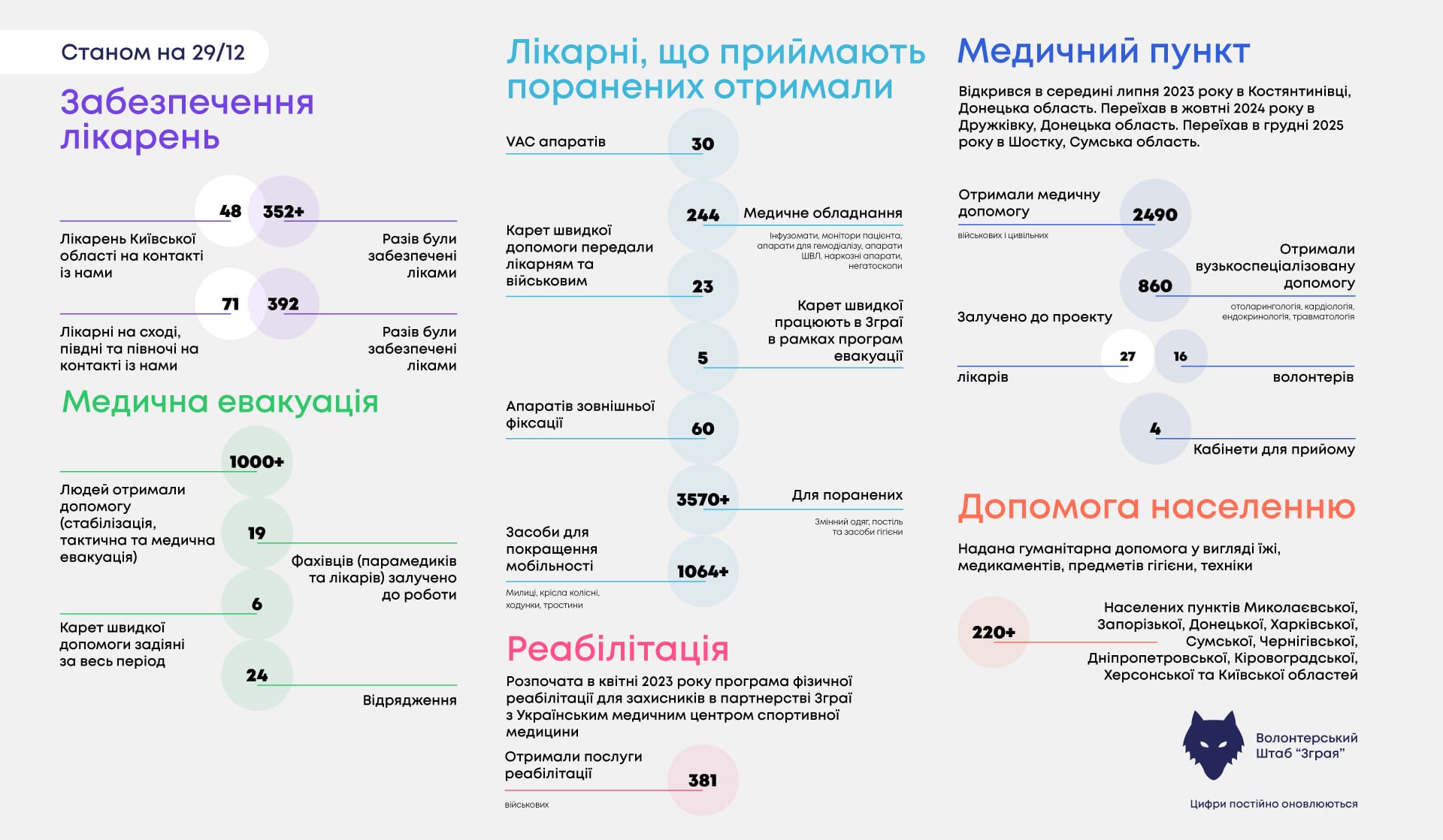 З початку квітня 2022 року ми розширили географію поїздок до Луганської, Донецької, Харківської, Запорізької, Херсонської та Миколаївської областей. Зараз ми допомагаємо військовим, лікарням, цивільним з першим пріоритетом у прифронтових зонах.